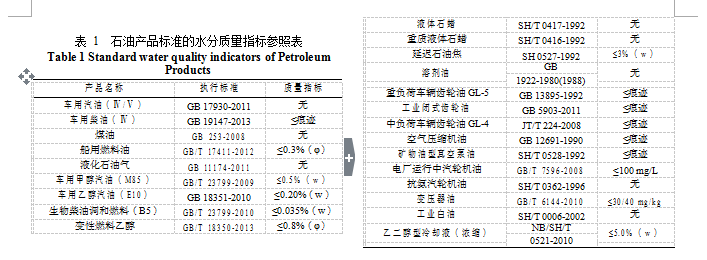石油產品標準的水分質量指標見表 1。