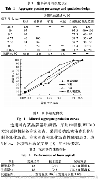 32.5 P.S.A 礦渣硅酸鹽水泥 。級(jí)配篩分 (水篩法)和混合料摻配試驗(yàn)結(jié)果如表 1 和圖 1 所示 , 合成級(jí)配范圍滿足文獻(xiàn) [ 8] 對(duì)泡沫瀝青冷再生混合料中粒式級(jí)配范圍的要求。