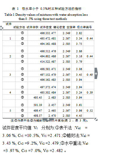 從上述統計結果可以看出, 水中重法測定的空隙率平均值**大, 空隙率偏差系數**小,依次是蠟封