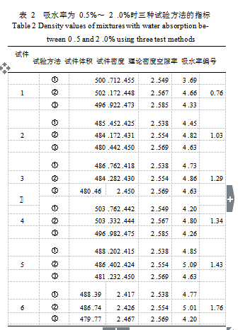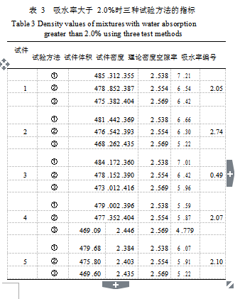 體積法適用于空隙率較大的瀝青碎石混合料及大空隙透水性開級配瀝青混合料。體積法因所測定試件體積準確度不高 ,所測密度誤差較大,在目前壓實瀝青混合料試驗中應用甚少。只有在吸水率特別大,前面三種試驗方法不能準確測定的情況下選用。因此 ,本文對體積法不進行分析比較。